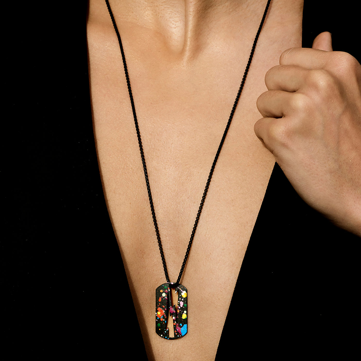 A l’occasion de cette collaboration avec l'artiste ZoulliArt, le pendentif plaque Lovetag se voit habillé d’une pluie de couleurs. Entre esprit ludique et artistique, le peintre s’amuse à créer des pièces uniques, chacune réalisées à la main.