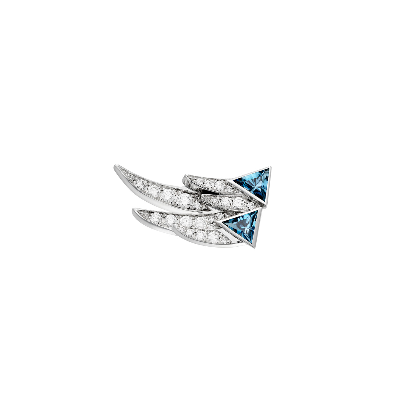Inspirée de la collection de pièces exceptionnelles au nom éponyme, la boucle d’oreille Spread Your Wings constituée d’ailes aériennes et minimalistes, se pose parfaitement sur l’oreille. Des créations qui se portent seules ou en duo, pour jouer sur une asymétrie totalement addictive ! Disponible en différentes pierres de couleurs précieusement taillées en triangle, Améthystes, Tsavorites ou Topazes Blue London fusionnent avec ces plumes courbes et effilées, pavées de diamants GVS.