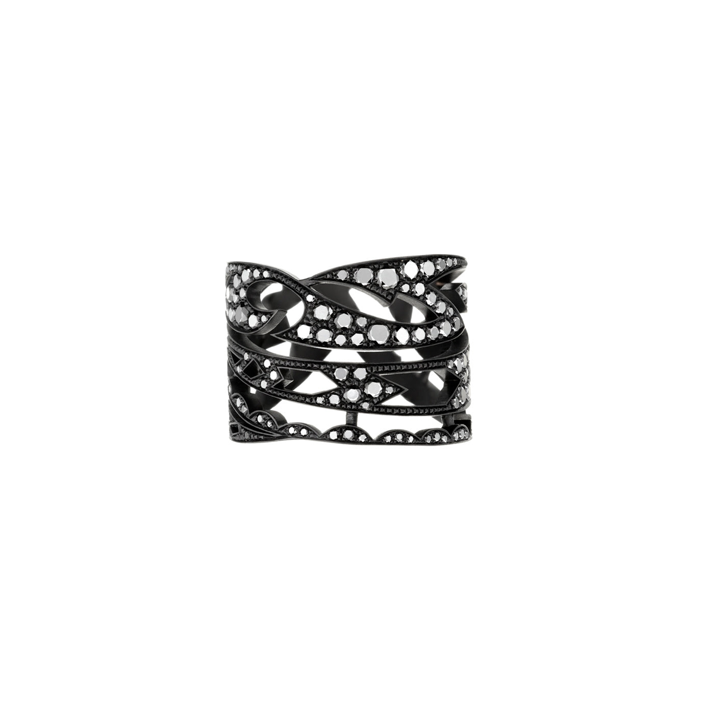 Les pièces en or noir 18 carats luxueusement pavées de diamants noirs électrisent leur graphisme.