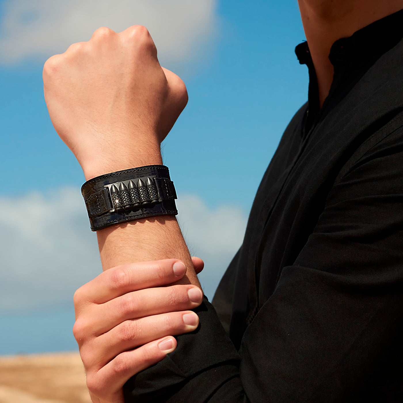 Cuff for men and women from the Bang Bang collection in the form of a leather bracelet with 5 titanium bullet inserts set with black diamonds, for a total carat weight of 3.03.